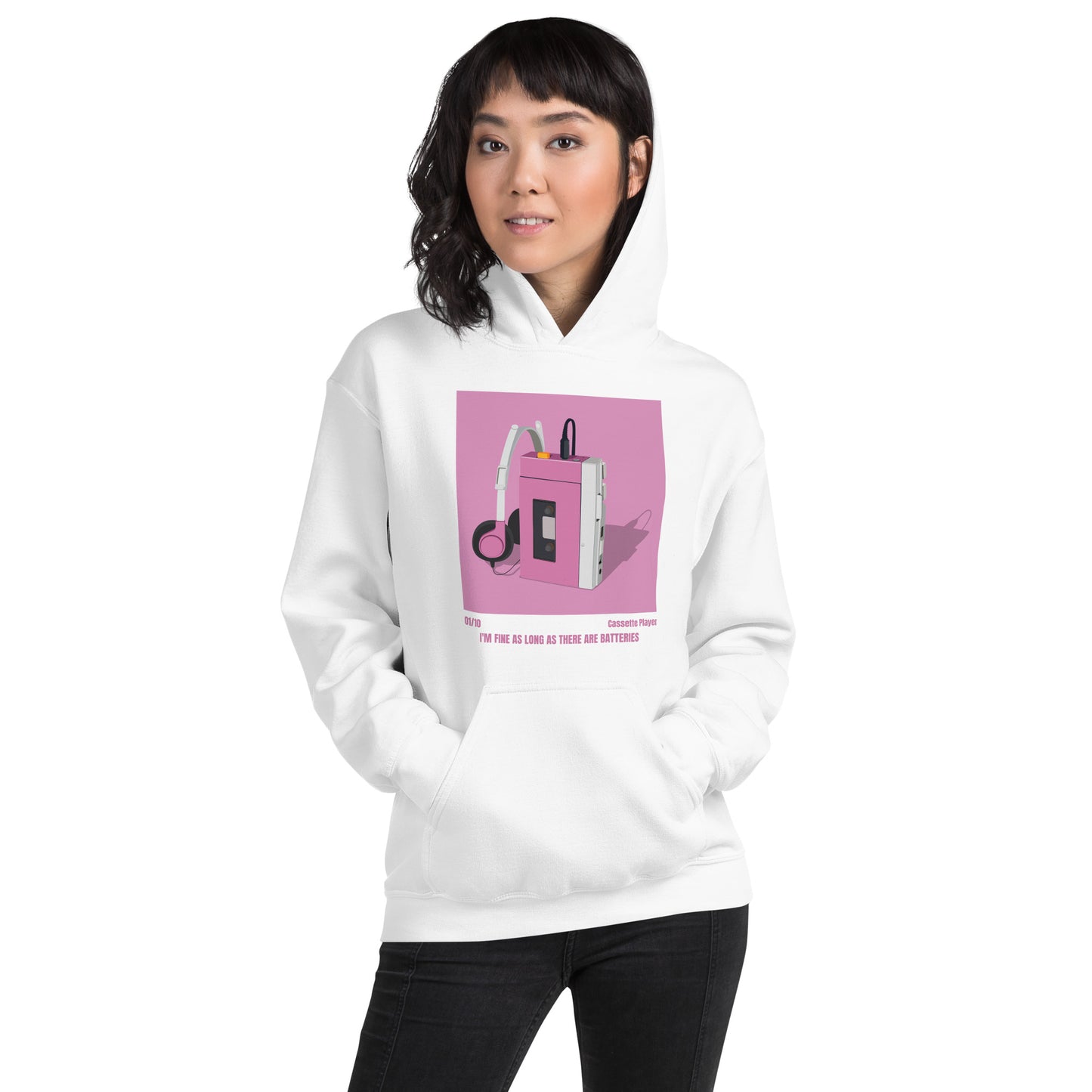 This retro hoodie features a unique cassette player design in stylish pink. Made with quality material, this unisex hoodie will keep you warm and fashionable. Get ready to stand out with this timeless hoodie!